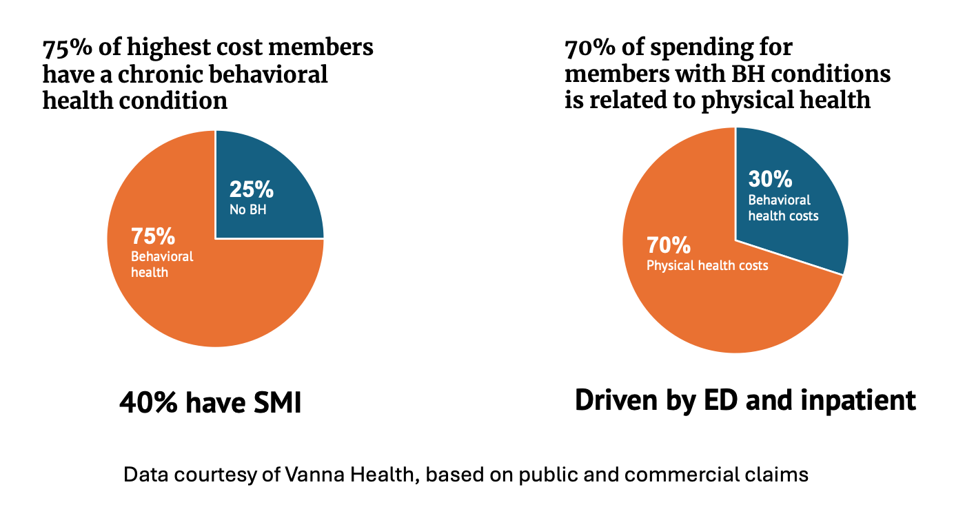 If these are essential for recovery, why don’t we deliver the 3 P’s? The answer is another P: payment. We spend a lot of money – over 17% of our GDP in the U.S. -- for healthcare. Focusing on the highest cost patients in our healthcare system, 75% have a behavioral health condition and roughly 40% have a serious mental illness. But of the nearly $5T we spend on healthcare, relatively little, roughly 6%, goes to behavioral healthcare. Most of the spend, especially for people with serious mental illness, is on physical health, neglecting treatment for the core problem. Emergency room visits and inpatient care drive much of these costs.